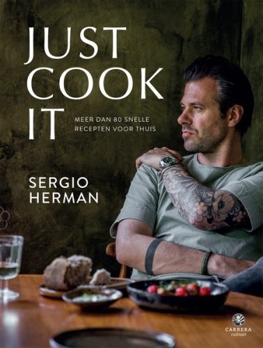 Sergio’s tip: ga gewoon in de keuken staan en ga aan de slag, want: “lekker koken is vooral een kwestie van doen. 2017 was voor mij privé een zeer heftig jaar. Thuis zijn is daarom voor mij nóg waardevoller geworden. Net als koken. In mijn eigen keuken kom ik tot rust en ben ik met lekker eten bezig. Daarbij is simpel wat mij betreft het toverwoord. De meeste recepten zijn gebaseerd op de keuken van mijn grote leermeester: mijn vader. Aan deze vroegere smaken heb ik mijn eigen twist gegeven. De basis blijft de eenvoudige bereiding van mooie producten. Mij even focussen op het product, op iets zo goed mogelijk op tafel zetten, op de mooiste bordjes en schalen uit de kast, die beleving geeft mij altijd mega plezier. Het gevoel van schoonheid en smaak deel ik graag via mijn kookboek.”
