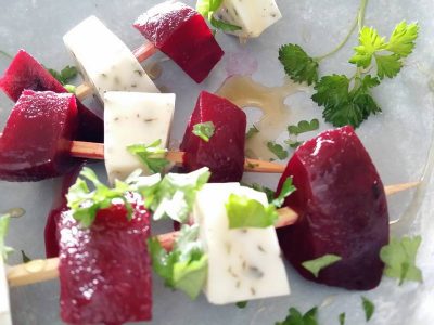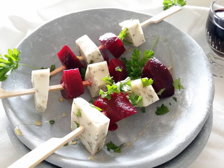 “Dit recept laat zien hoe eenvoudig lekker snacken soms kan zijn. Deze prikker van stukjes gekookte rode biet en kruidengeitenkaas smaakt voortreffelijk bij een glas rode wijn!”